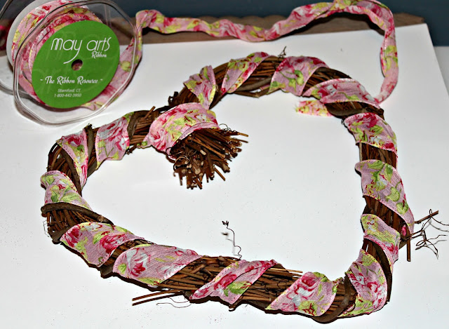 Begin by wrapping a 9″ heart wreath with the Spring Floral 1.5″ Ribbon.