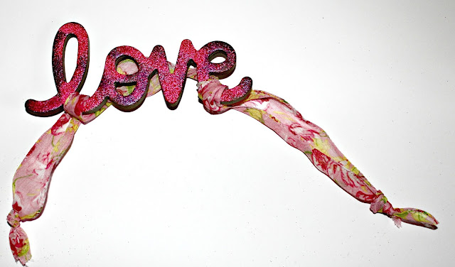 Cut a piece of Spring Floral; Tie at both ends. Wrap around prepared “Love” Chipboard.
