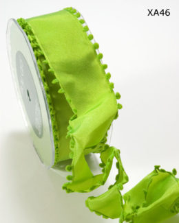 This 1 ½ inch by 25 yard ribbon is a woven solid with pom pom edges. The wired edge allows you to bend and shape your creations and decorate with ease. This ribbon would add a fun touch to a gift wrap or party décor and holiday DIY projects. It adds the perfect touch of texture to just about anything.